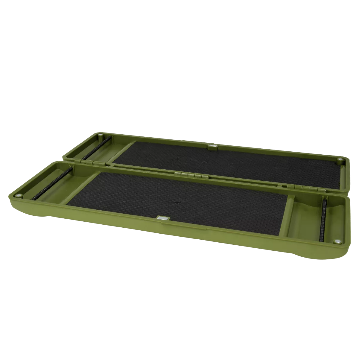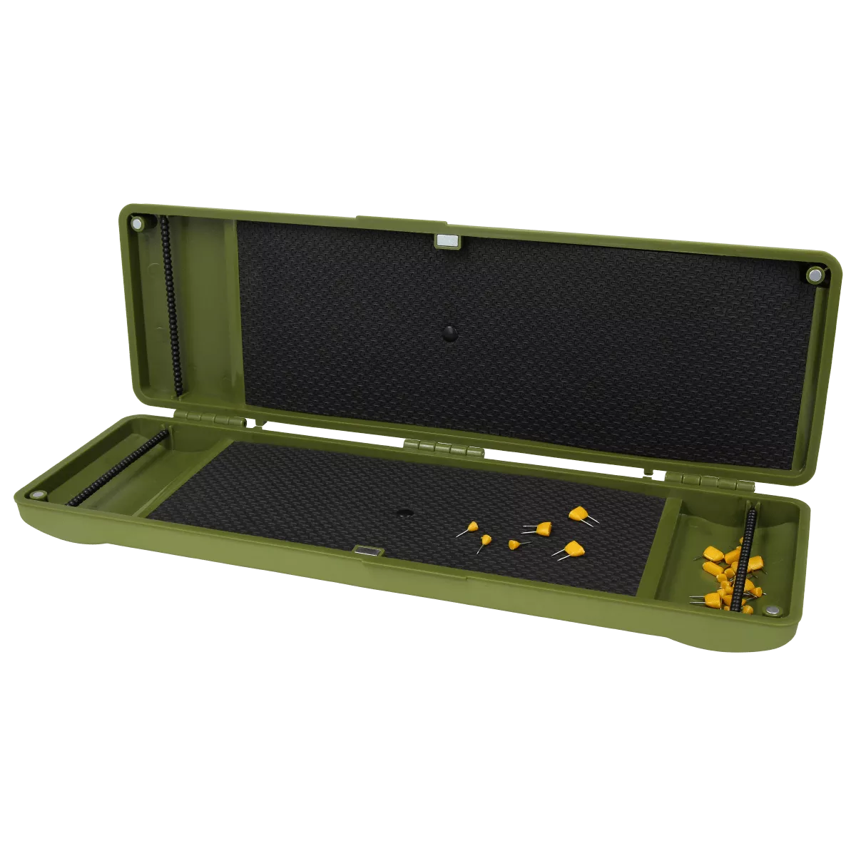 The magnetic locking system securely closes the leader box. Near the ribbed crossbar, the box has a recess that simplifies access to rigs and allows hooks to be positioned with the barbs facing up for easier viewing.