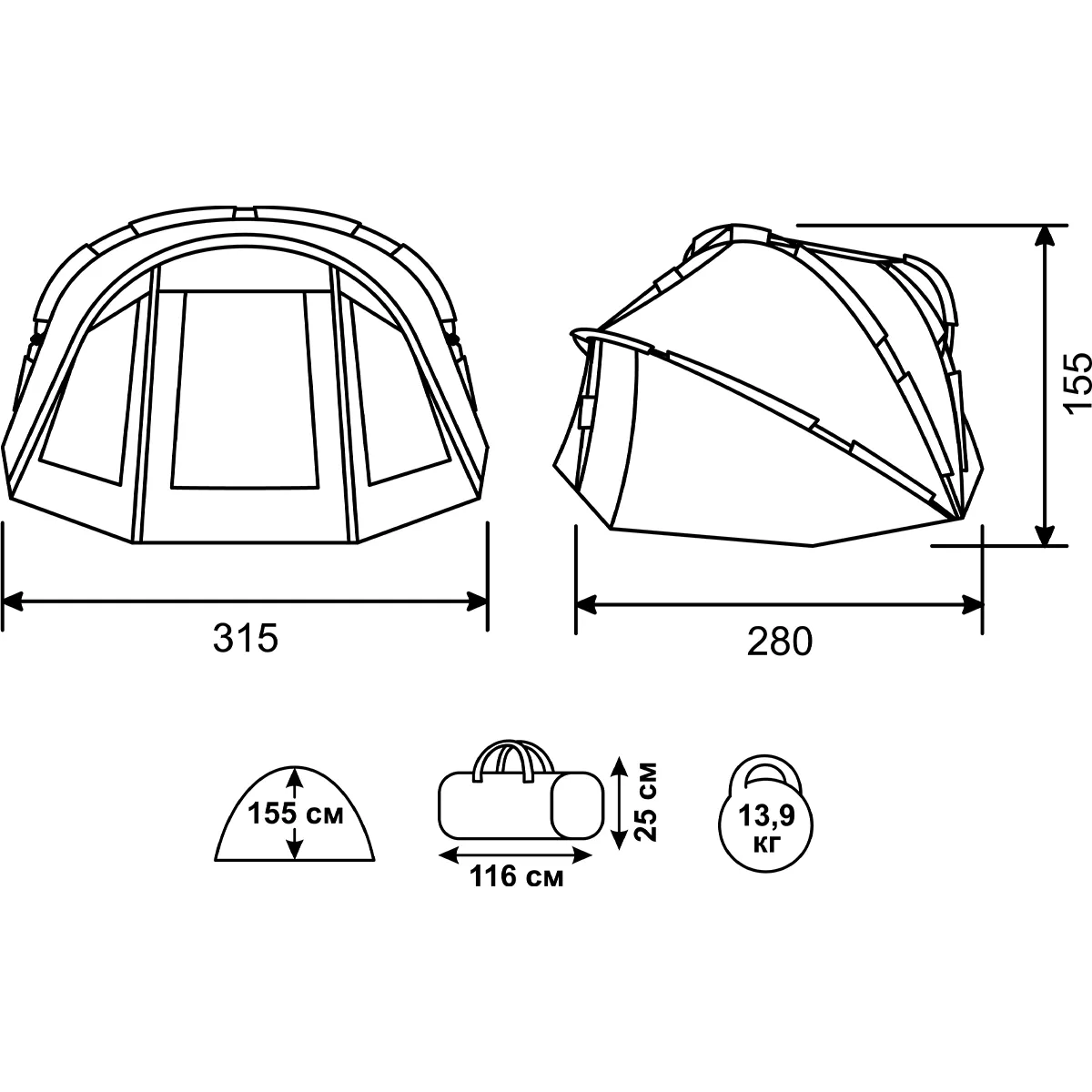 The aluminum frame with 16 mm thick tubes ensures the tent remains stable even in stormy winds. Large mosquito nets provide reliable protection from pesky insects. Fifteen powerful screw-type steel pegs come with a convenient handle and a storage case to prevent loss.