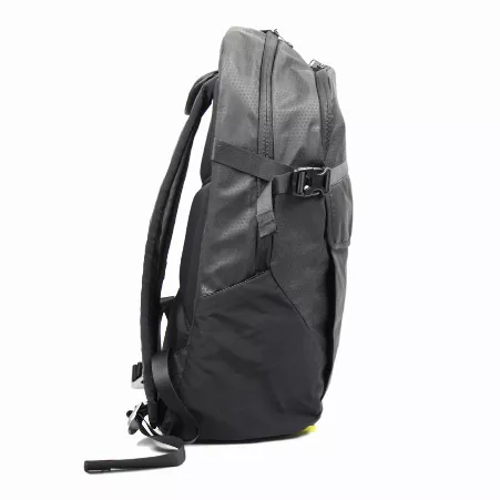 On both sides of the backpack, there are two open quick-access pockets and two compression straps with quick-release buckles for securing bulky items.