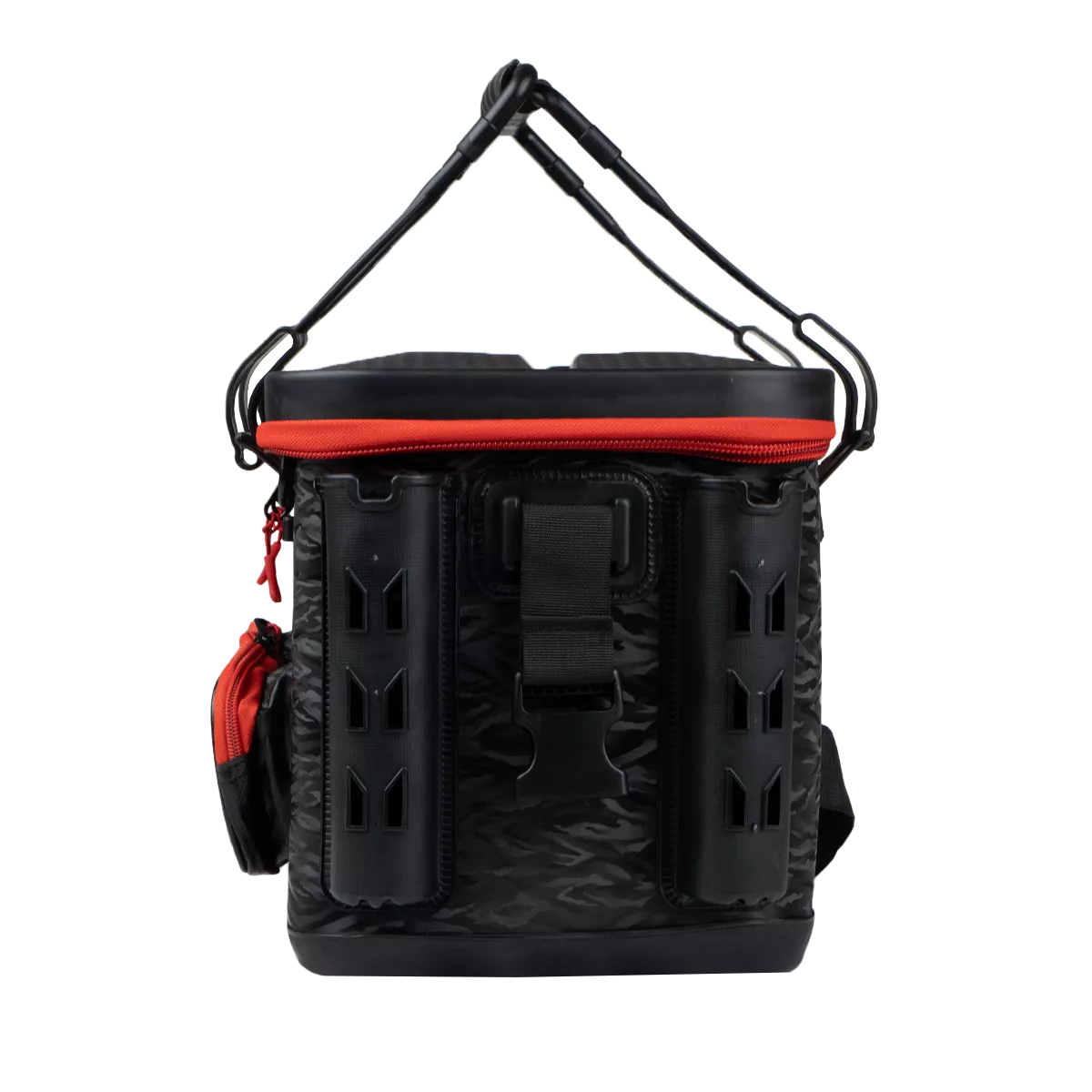 – A small open pocket on the side is ideal for fishing tools, which can be additionally secured via a retractor using a plastic D-ring located slightly above.
